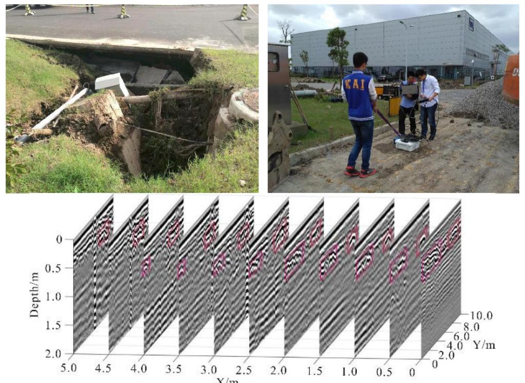 图2 塌陷现场探测与实测雷达三维剖面